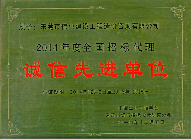 > 资质荣誉 > 2014年全国招标代理机构诚信先进单位